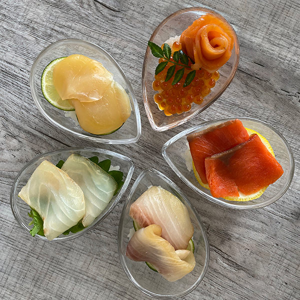 Kaoriで人気のスモーク5種(キングサーモン・紅鮭・かんぱち・真鯛・帆立)を食べられる、お味見におすすめのセットです。1人用のおつまみやおかずとしてもご利用いただけます。