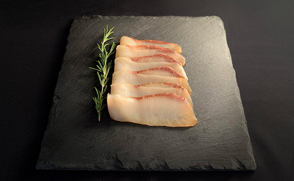 透き通る白い身が美しい真鯛のスモークです。適度な脂のりで、お刺身とは違ったモチモチとした上品な歯ごたえと甘味があります。桜チップの薫りで魚臭さを消しているので魚が苦手な方にも食べていただきやすいです。