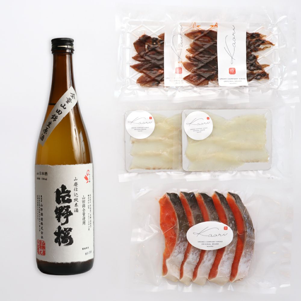 おつまみは【ほたるいか燻製】【真鯛燻製】【桜燻汐鮭】のセットです。深いコクとふくらみのある濃醇旨口の味わいの片野桜と本燻製をどうぞ味わってください。