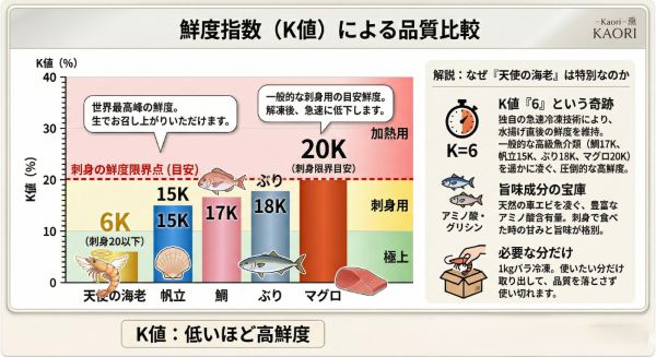 世界のプロ料理人が絶賛する理由は、圧倒的な鮮度と極上の旨みにあります。水揚げ直後の急速冷凍により、一般的なお刺身基準を遥かに凌ぐ驚異の鮮度「K値6K」を維持。天然車エビ以上の豊富なアミノ酸を含み、お刺身で食べれば、これまでにない濃厚な甘みが口いっぱいに広がります。