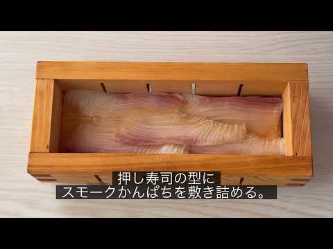 今日ご紹介するのは「スモークかんぱち」を使った押し寿司です。酢飯は、赤しそふりかけを混ぜ込んだものといり卵を加えたもの、2種類用意して色鮮やかな二層仕立てにします。赤しそふりかけの酸味と炒り卵の甘みが、脂ののった旨味たっぷりの「スモークかんぱち」の味わいを一層引き立てます。