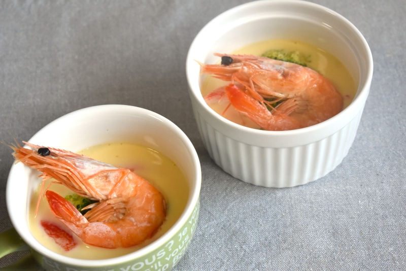 出汁の代わりにコンソメを加えた卵液にブロッコリー、カニかまぼことともにスモーク天使の海老(冷燻製)を加えて蒸し上げました。