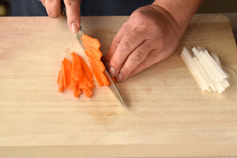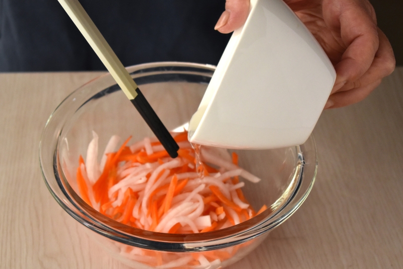 ここでは、ベトナムで定番のサンドイッチに仕上げました、なます風の大根&にんじんの甘酢漬けでさっぱりと。