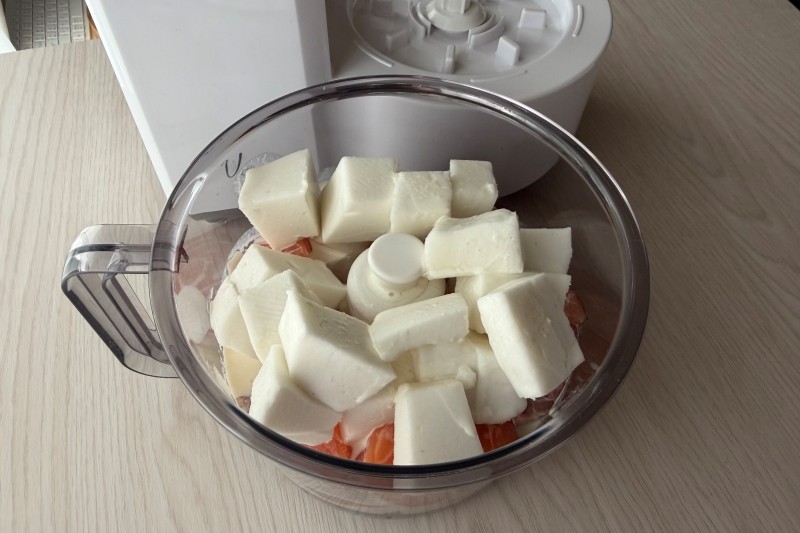 卵白、生クリームとともにフードプロセッサーに入れてなめらかになるまですりつぶす。