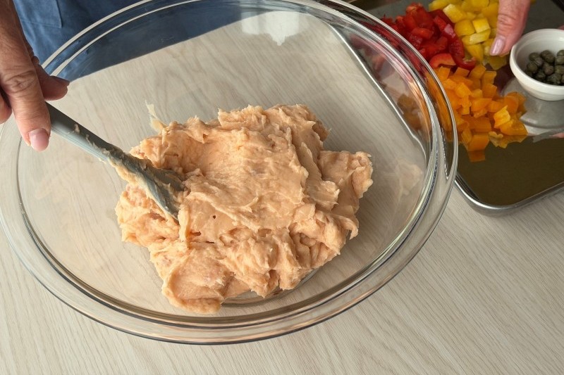 ②①をボウルに入れ、5㎜角に切ったパプリカ、ケイパーを加えて混ぜ合わせる。