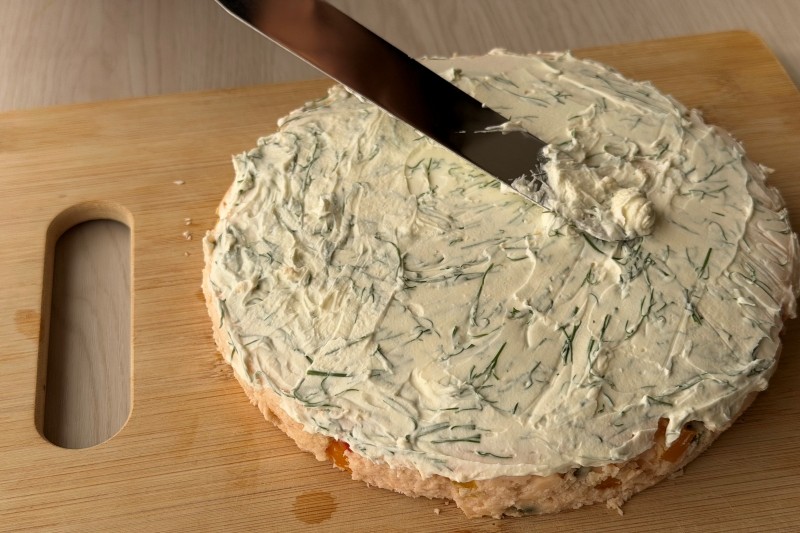 上面に塗った、ディル入りのサワークリームがサーモンと相性抜群です。クリームを塗る前に、あら熱をとった後冷蔵庫で冷やしておきましょう。パプリカは味も、見た目も食感もアクセントになっています。