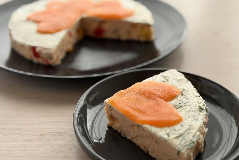 さて、今回はこうした可愛らしい形を生かして、サーモンテリーヌの上に飾ってみました。通常テリーヌというと四角い形に作ることが多いと思いますが、今回は上面に四葉のクローバーを飾るべく、丸型で作りました。型は100均で売っている紙のケーキ型を使用してもOKです。