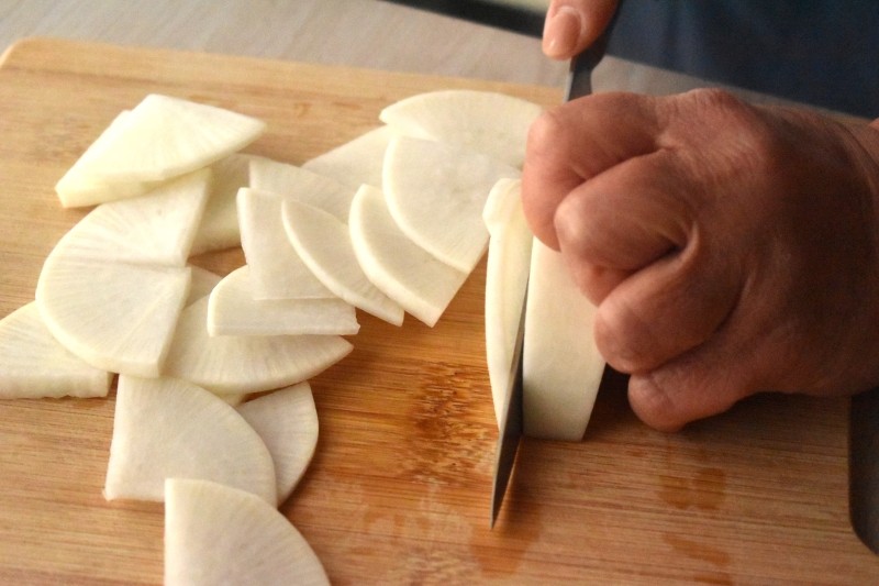 大根、にんじんは薄いいちょう切り、ひらたけは食べやすい大きさに分けておく。