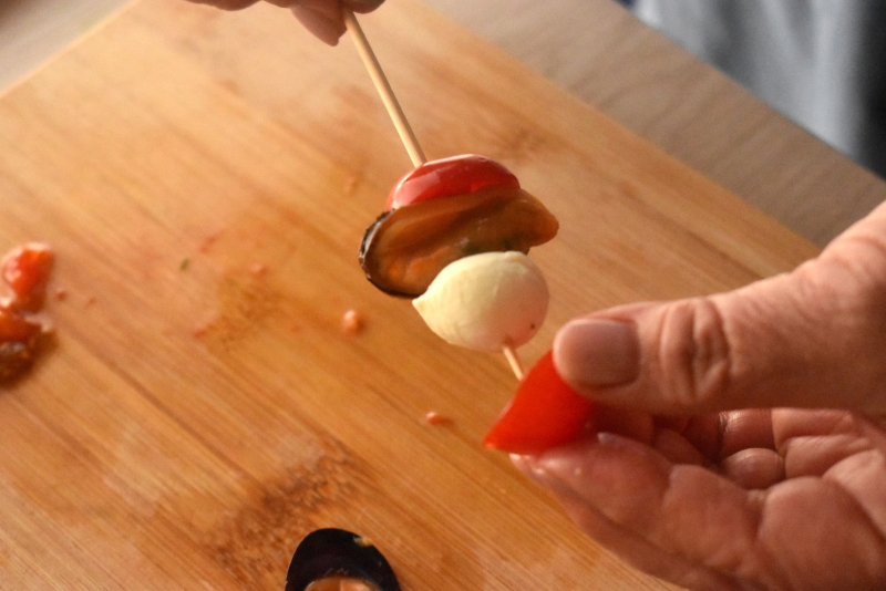 〇ミニトマトは半分に切って種を除き、モッツァレラチーズ、ムール貝とともに串にさす。