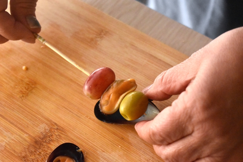 〇ぶどう、ムール貝、オリーブを順に串にさす。