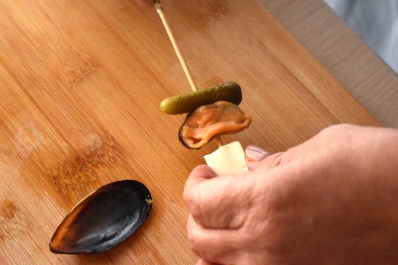 〇ピクルス、ムール貝、クリームチーズ、の順に串にさす。
