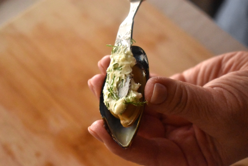 〇殻に乗せたムール貝に粗く刻んだディルとサワークリームを合わせたものを塗る