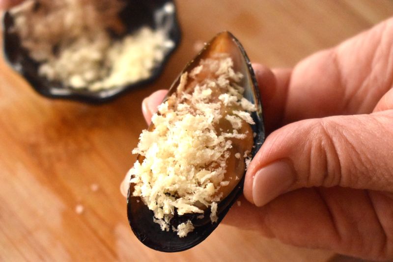 〇殻に乗せたムール貝にパン粉と粉チーズを合わせたものをのせ、オーブントースターで軽く焦げ目がつくまで焼く。